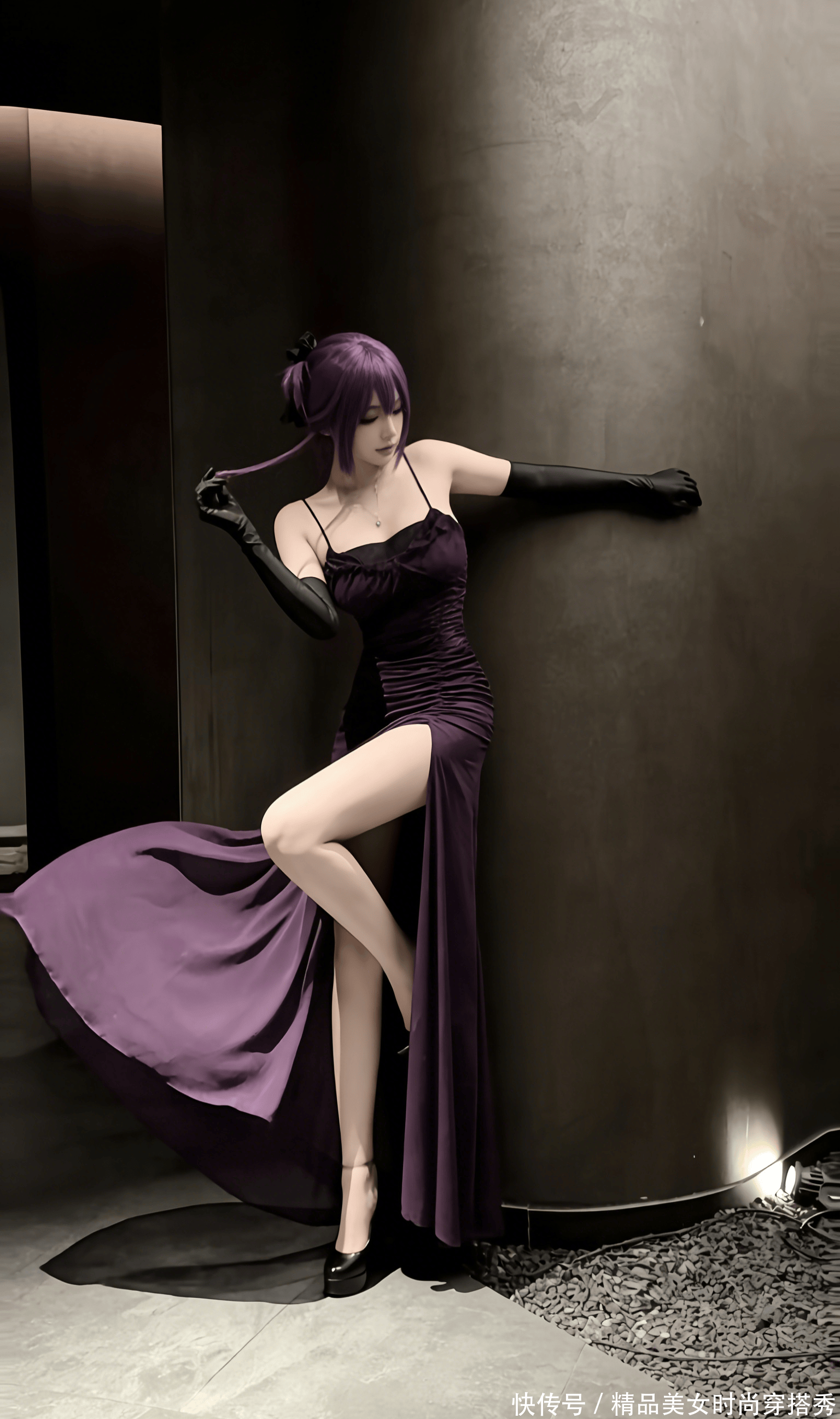 地面的冷硬与她裙摆的柔软形成了鲜明的对比,光与影在她身上交织,将每一寸曲线都勾勒得淋漓尽致。紫色的裙摆如藤蔓般蔓延在地面,像是要将看客的目光牢牢缠住,再也移不开。她没有回头,却能让人想象到她回眸时的眼神 —— 是带着魅惑的笑意,还是带着疏离的冷淡?这种未知的悬念,反而让画面更具吸引力。
